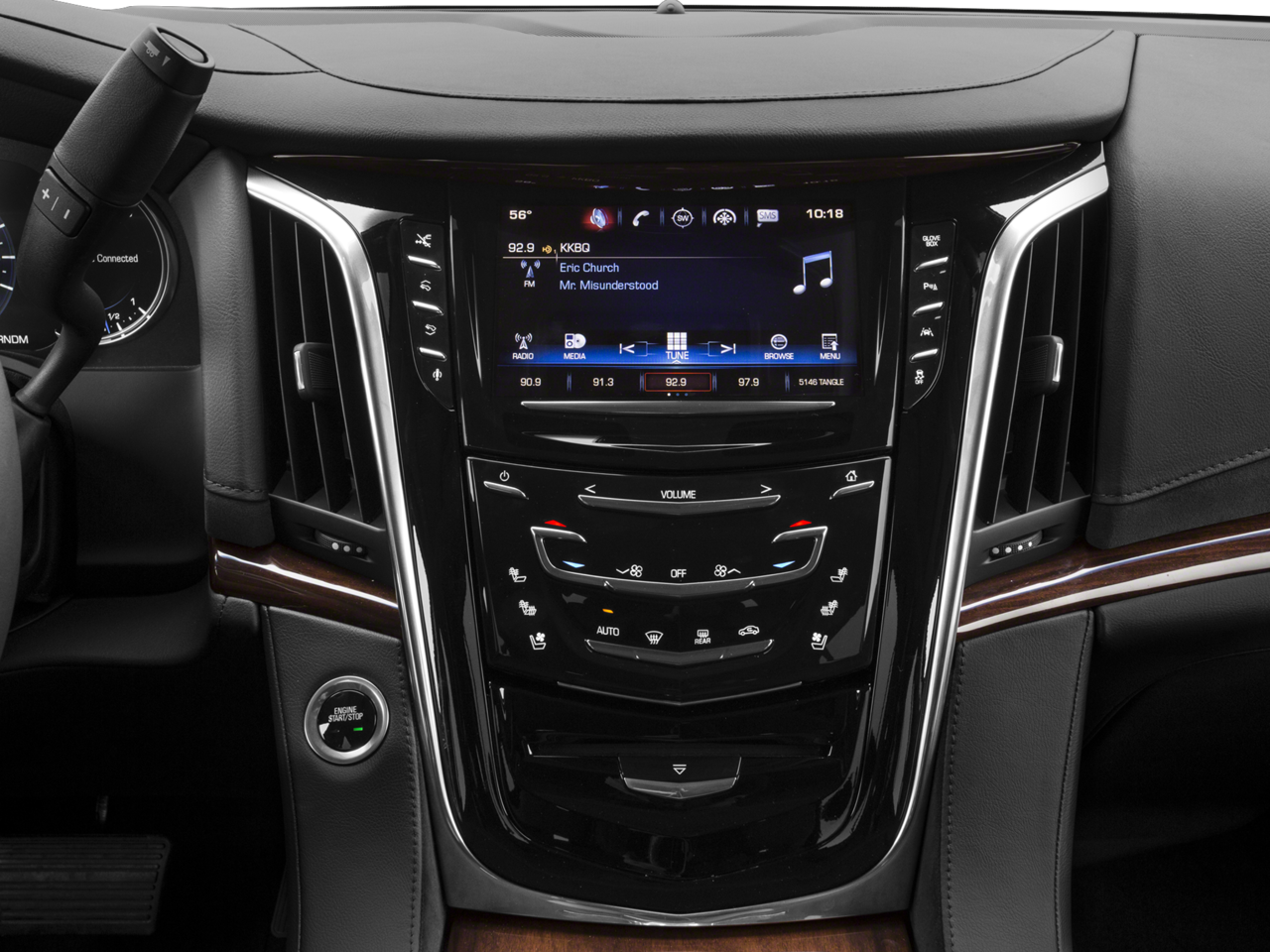 - Cadillac CUE Information and Media Control System with Embedded Navigation 8" diagonal color information display featuring touch response, haptic feedback, gesture recognition, Natural Voice Recognition and Phone Integration for Apple CarPlay capability for compatible phone. Five USB ports, including one in the articulating storage door/bin and auxiliary audio port